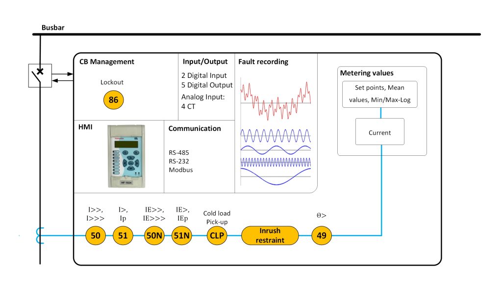 رله حفاظت اضافه جریان HF1024 یکی از تجهیزات مهم حفاظتی در سیستمهای قدرت است که برای تشخیص و قطع جریانهای غیرعادی یا خطا در شبکه استفاده میشود. این رلهها با نظارت مداوم بر جریان مدار، در صورت افزایش غیرمجاز جریان (ناشی از اتصال کوتاه، اضافه بار یا سایر خطاها)، عمل کرده و با ارسال سیگنال به کلیدهای مدارشکن (Circuit Breakers)، باعث ایزولاسیون بخش معیوب شده و از عملکرد غیرعادی شبکه جلوگیری میکند. این رله با ارائه حفاظتهایی نظیر حفاظت اضافه جریان فاز، اضافه جریان زمین و اضافه بار حرارتی در زمان بروز خطا، مانع از عبور جریان مازاد میشود و از ایجاد خسارت جلوگیری میکند. همچنین امکان تشخیص جریان هجومی و Cold Load Pickup را داشته و مانع از عملکرد اشتباه رله در مواقع مربوطه میشود.
