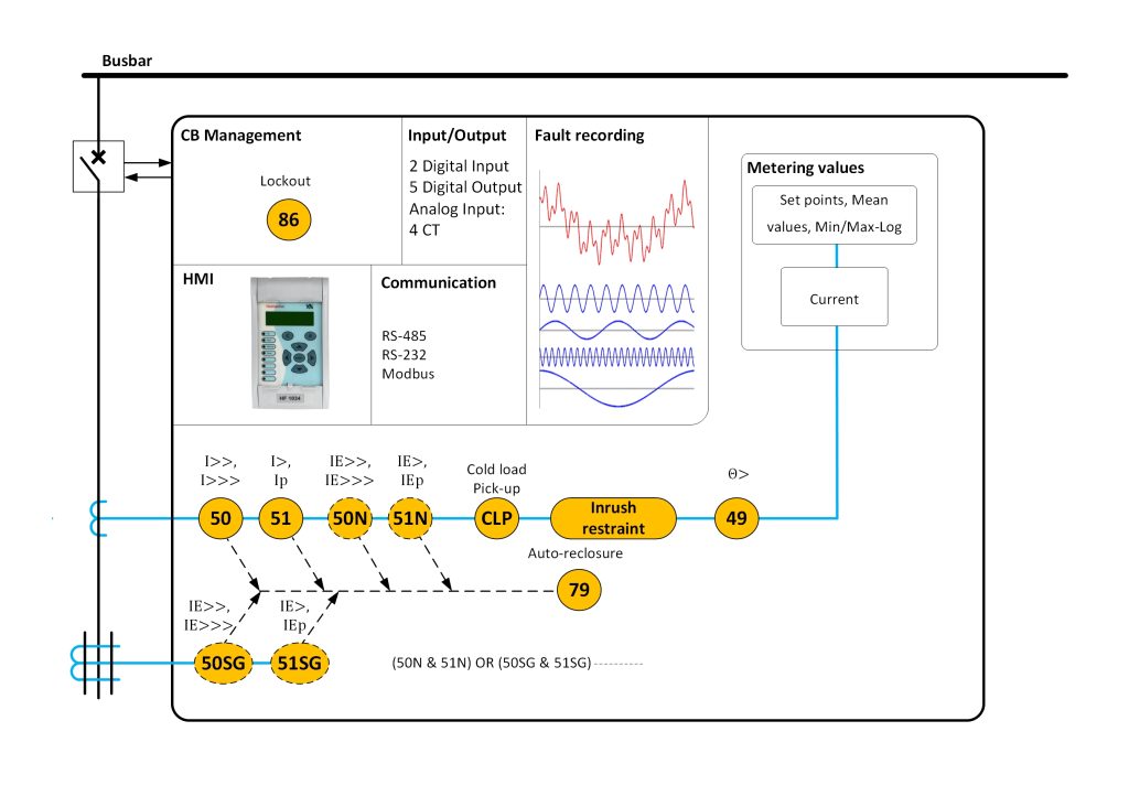 رله حفاظت اضافه جریان HF1034 یکی از تجهیزات مهم حفاظتی در سیستمهای قدرت است که برای تشخیص و قطع جریانهای غیرعادی یا خطا در شبکه استفاده میشود. این رله با نظارت مداوم بر جریان مدار، در صورت افزایش غیرمجاز جریان (ناشی از اتصال کوتاه، اضافه بار، یا سایر خطاها)، عمل کرده و با ارسال سیگنال به کلیدهای مدارشکن (Circuit Breakers)، باعث ایزولاسیون بخش معیوب شده و از عملکرد غیرعادی شبکه جلوگیری میکند. همچنین در عمل بخاطر مجهز بودن به تابع بازبست خودکار، در هنگام بروز خطاهای گذرا، بعد از مدت کوتاهی کلید را وصل میکند. این رله با ارائه حفاظتهایی نظیر حفاظت اضافه جریان فاز، اضافه جریان زمین، بازبست خودکار و اضافه بار حرارتی در زمان بروز خطا، مانع از عبور جریان مازاد میشود و از ایجاد خسارت جلوگیری میکند. همچنین امکان تشخیص جریان هجومی و Cold Load Pickup را داشته و مانع از عملکرد اشتباه رله در مواقع مربوطه میشود.